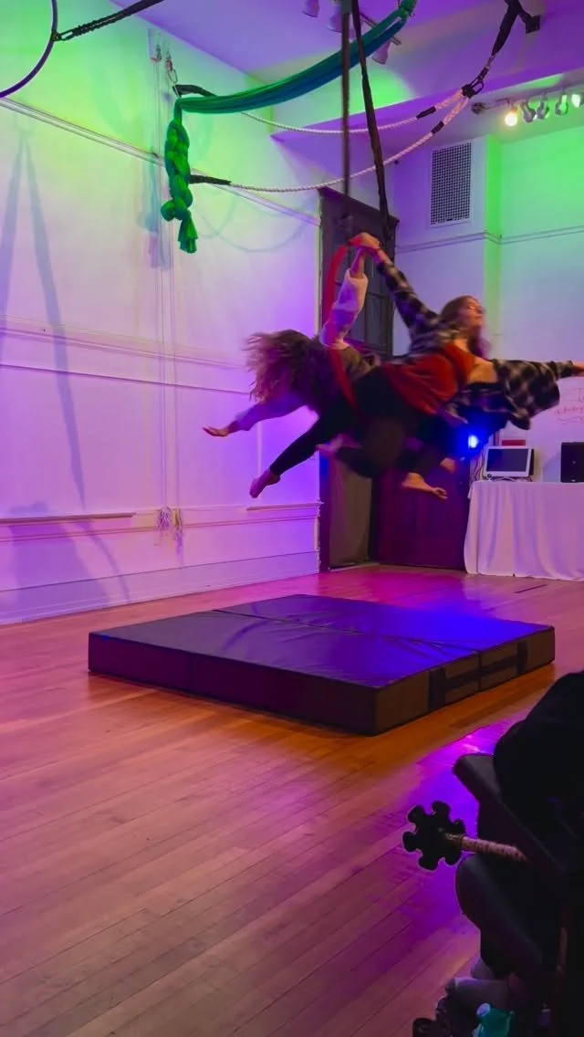 Whether you're a beginner or looking to level up, our programs build strength, flexibility, and confidence in a fun, supportive space. We offer youth and adult classes in aerial silks, trapeze, lyra (aerial hoop), sling, and various ground skills.