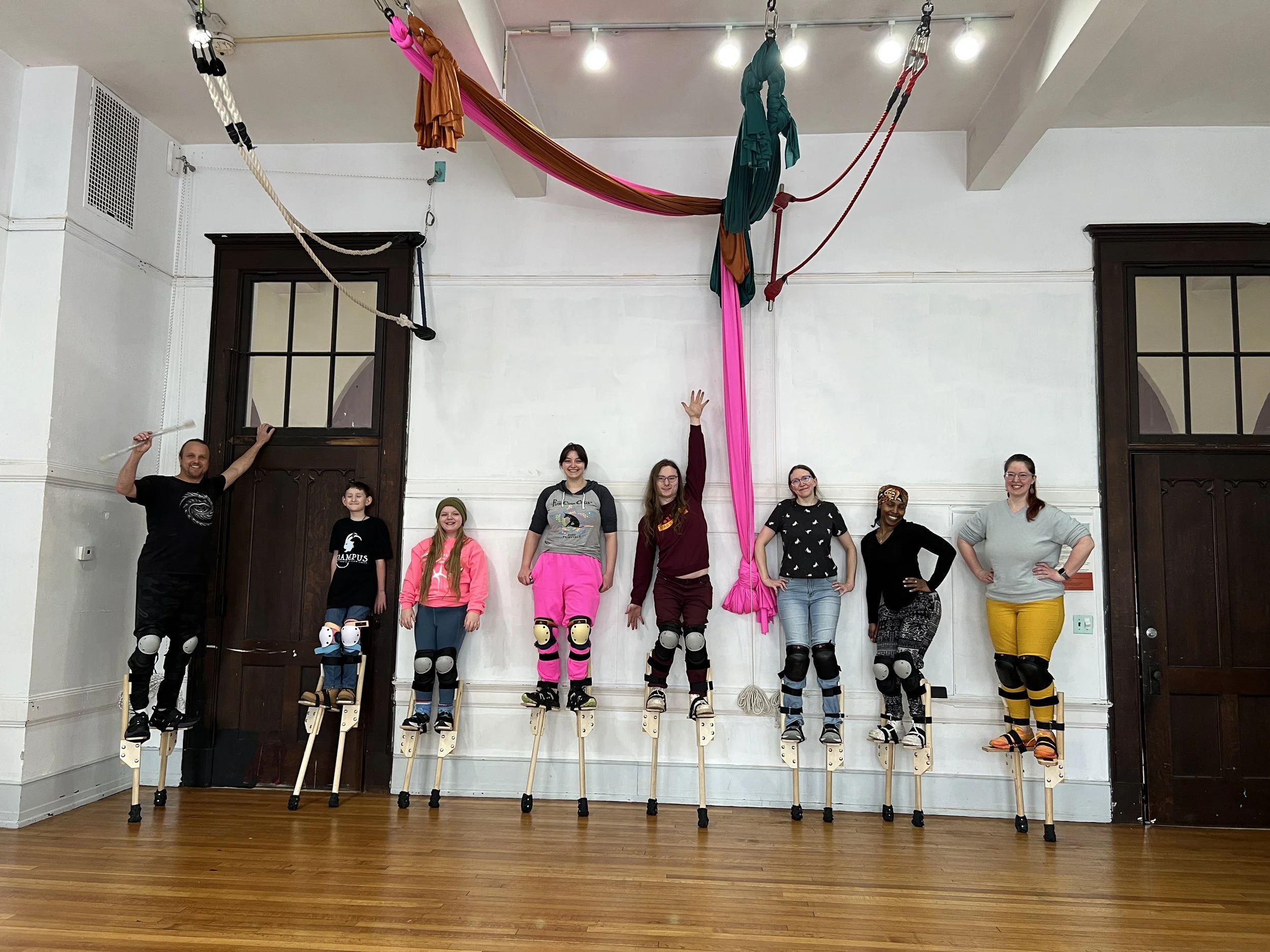 All equipment is provided: stilts, ties, and knee pads. Please wear a comfortable pair of clean, closed-toed shoes.